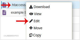 5. Right click on the .htaccess file and then on "Edit" or "Code Edit" in the Context Menu.