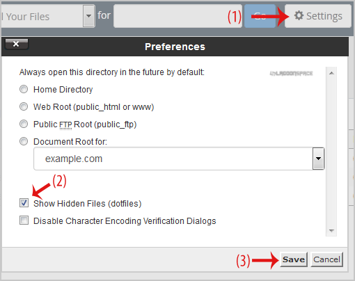 5. If the .htaccess file does not show, click on the "Settings" button in the File Manager. You can find the "Settings" button on the Right Side of the top menu. A new small window will open. Mark the "Show Hidden Files (Dotfiles)" option and click on the "Save" button. You will be able to see the .htaccess file. If it does not exist, create a new one.