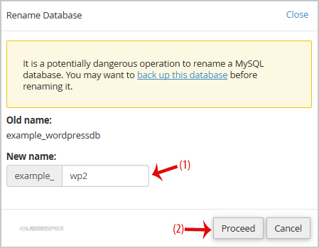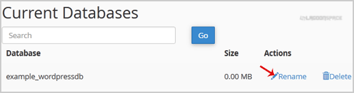 1. Log into your cPanel account.2. In the "Databases" section, click on "MySQL Databases" Icon. 3. Under "Current Databases", You can see list of your all databases. Locate the Database and then click on "Rename" Icon.4. Change database name and then click on "Proceed" button.