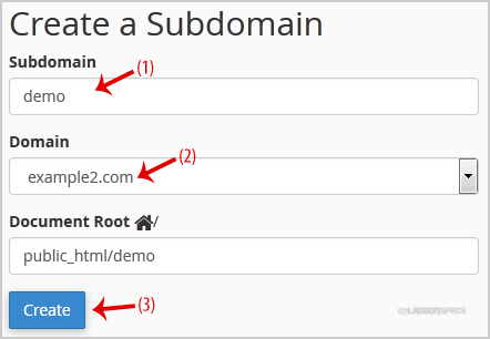 3. Under "Create a Subdomain" in the "Subdomain" field you should enter your subdomain name like "demo"(without quota) and should you have a number of domains, select the appropriate domain from the dropdown list.