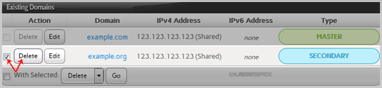 4. Under "Existing Domains " tab, Select Appropriate domain name you want to delete.