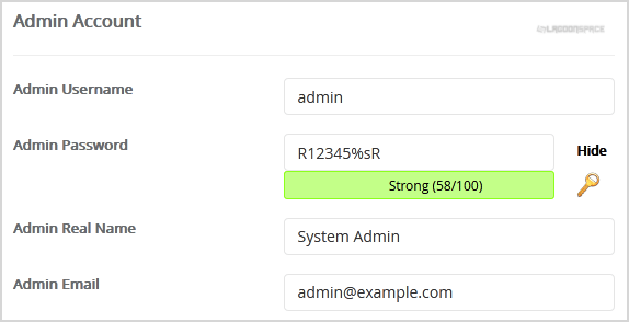 • Admin Username: The default username is "Admin" and the edit option is disabled.