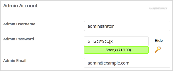 - Admin Username: Your new PopojiCMS username (for security reason do not use the "Administrator" or the "Admin" username.)