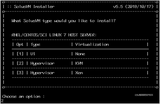 Then it will show you an option to choose virtualization. Most people prefer KVM and others Xen. Select your preferred virtualization by typing 1 or 2 and then press Enter. For KVM, we enter 2 and then hit Enter.
