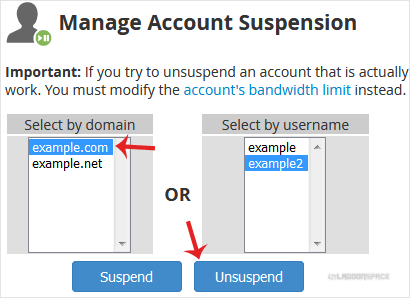 3. Under Select by Domain, choose the user you wish to unsuspend or if you know only the username, select the user under Select by User from the dropdown list. If the user is displayed in red color, it means he is suspended but if it is showing normally then the user is already unsuspended and you do not need to unsuspend it.