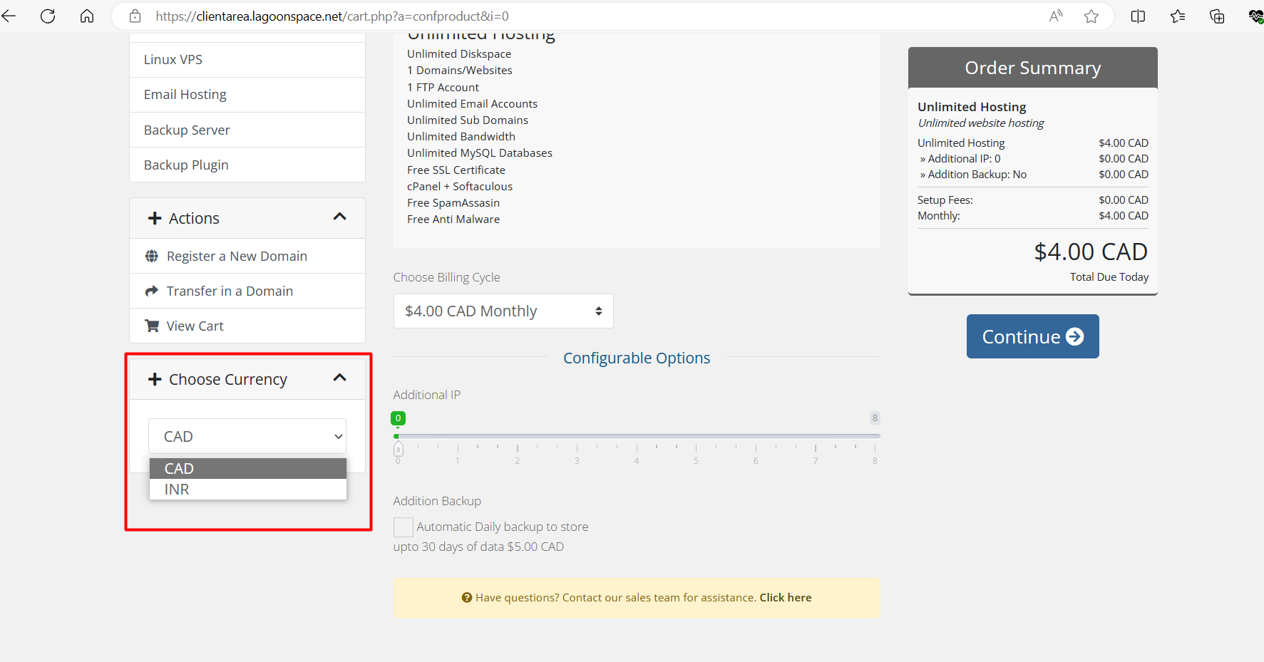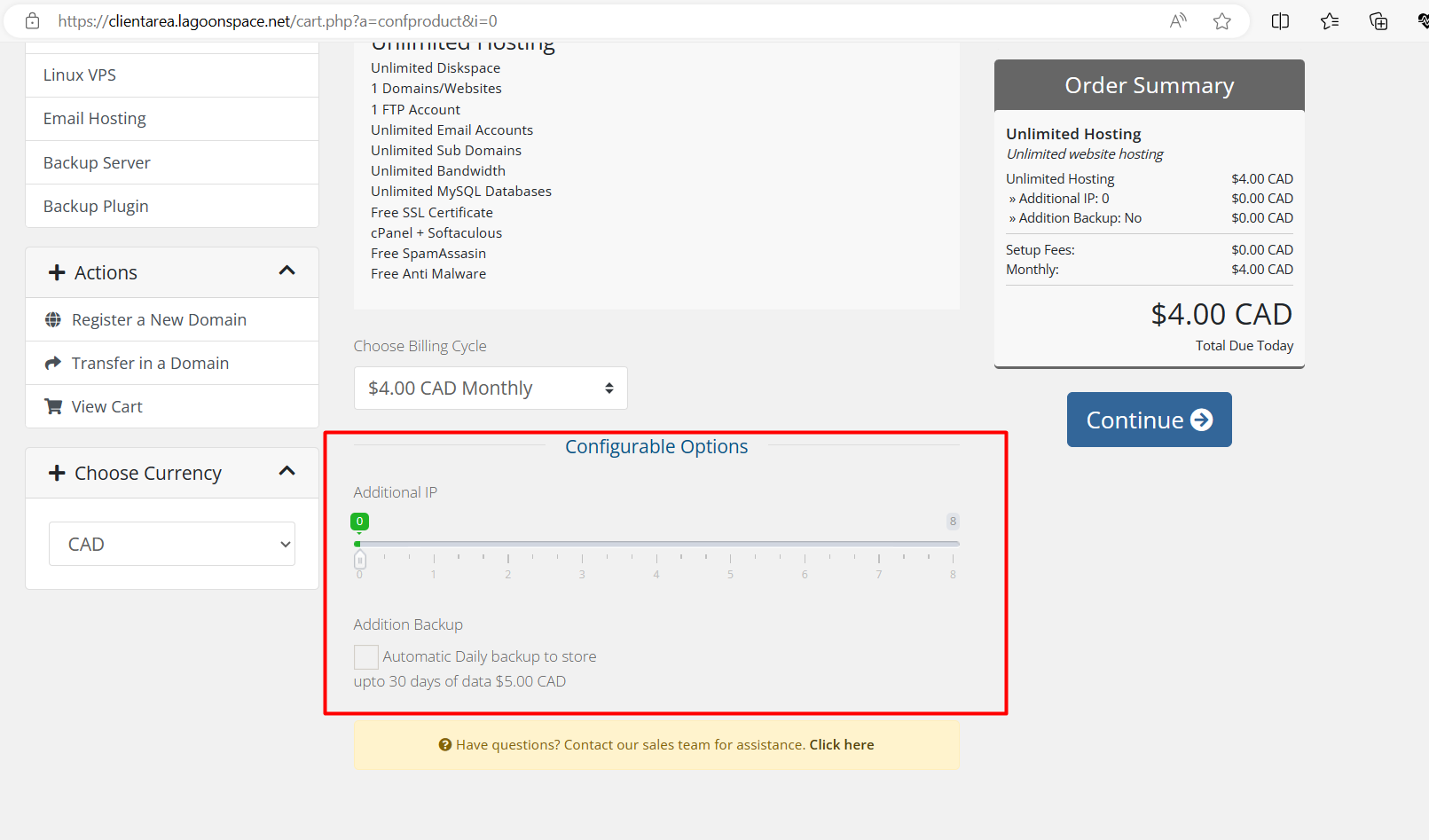 - We have some configurable options where you can request Additional IP or Additional backup. Please select if you want to add that to your order. There are some services like VPS which offer additional resources like extra CPU, RAM an Storage.